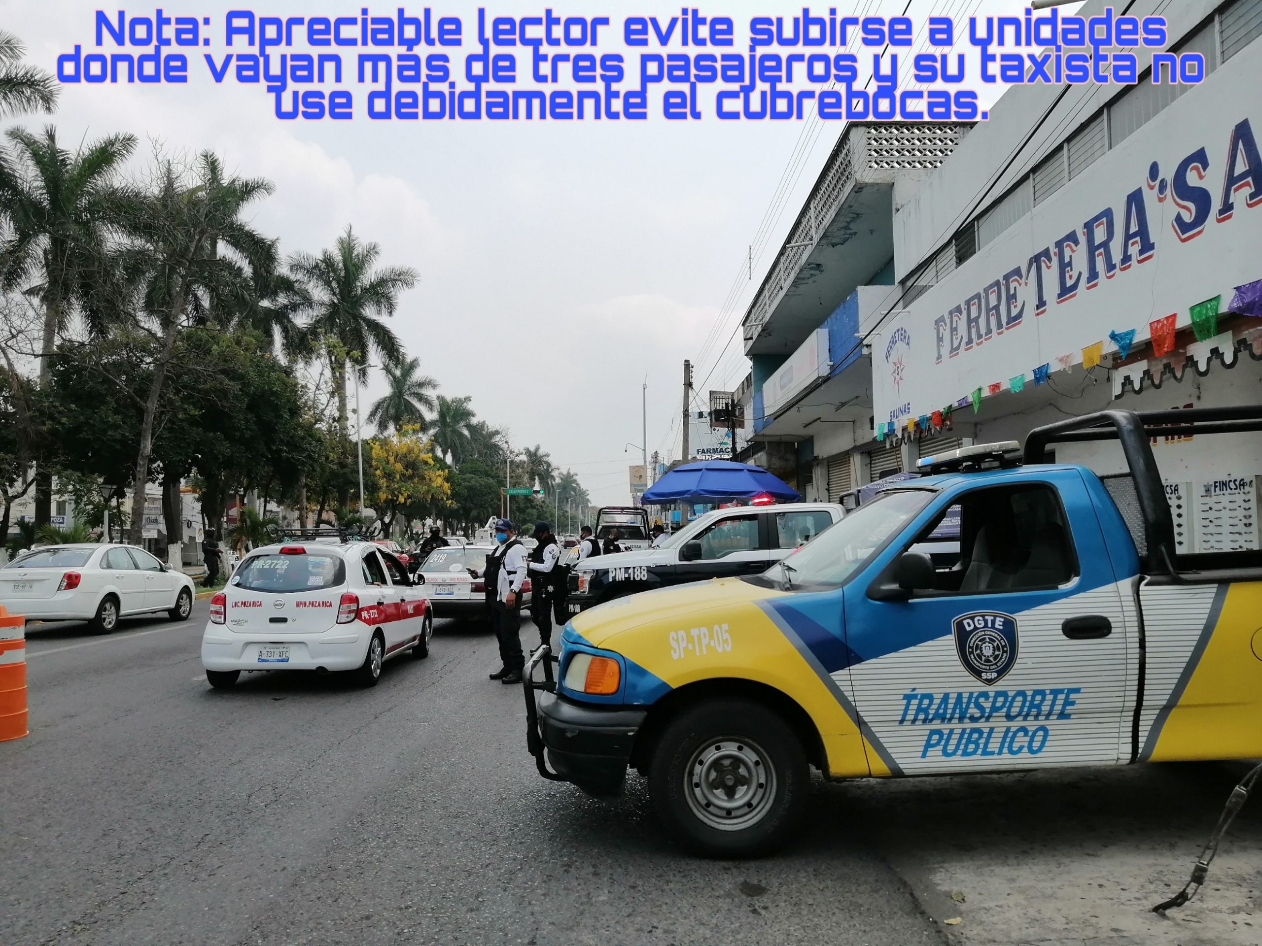 Inició sobre el bulevar Ruíz Cortínes, con la finalidad de verificar que los taxistas cumplan con las medidas sanitarias y qué acaten la instrucción de solo circular con tres pasajeros, ya que muchos de ellos andan circulando con cuatro y hasta cinco pasajeros, violando con esto la medida de sana distancia y poniendo en riesgo de contagio a los usuarios.