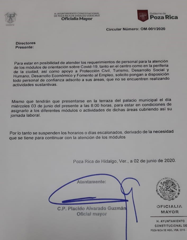 Circula ya un documento para que se presenten este 3 de junio para ponerse a disposición, sin ganas de apoyar y en contra de su voluntad, ahí estarán para arriesgarse al menos los empleados de confianza a un contagio, pues también necesitan llevar el sostén a sus hogares, y no pueden darse el lujo de negarse cuando las fuentes de empleo en ésta época son nulas.