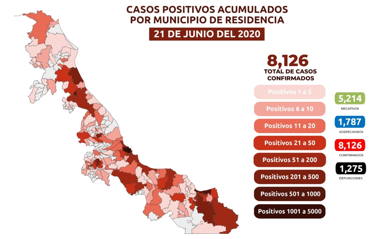La cifra de positivos acumulados es de 8 mil 126 en 160 demarcaciones; 4 mil 776 recuperados, 2 mil 75 en vigilancia y mil 146 activos: Veracruz, 2721, Coatzacoalcos 765, Poza Rica 523, Córdoba 360, Minatitlán 357, Boca del Río 309, Xalapa 228, Tuxpan 216, Orizaba 152; Cosoleacaque 143, Cosamaloapan 128, Papantla 122; Medellín 112, San Andrés Tuxtla 109, Fortín 103, Tierra Blanca 73, Coatzintla 72; Las Choapas y Martínez de la Torre 66; Nanchital 65, La Antigua 59, Alvarado 54, Perote y Tihuatlán 50; Acayucan, Río Blanco 49, Agua dulce 48 y Jáltipan 44.