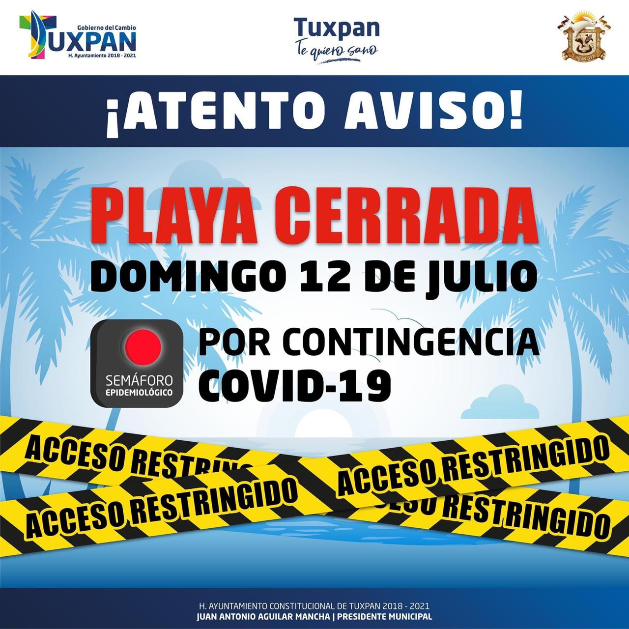 El acceso a la playa estará restringido el próximo domingo 12 de julio así lo anuncia en sus redes sociales oficiales la primera autoridad autoridad del municipio. Lo anterior derivado de la contingencia sanitaria por el Covid 19, decretada por la Secretaría de Salud Federal y, en apego a los lineamientos establecidos para el semáforo epidemiológico marcado en ROJO para el estado de Veracruz.