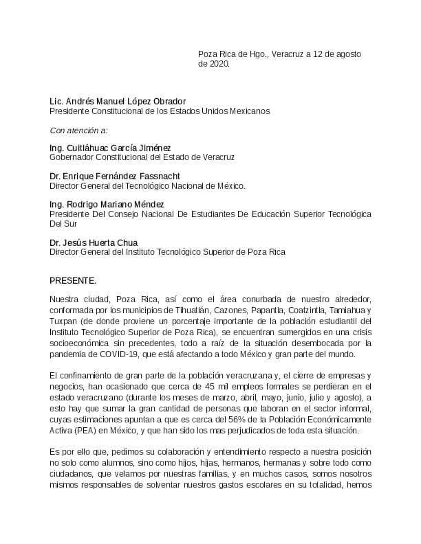 Ante esto, solicitamos la reducción del 25-30% y/o el aplazamiento del pago de inscripción y reinscripción del Ciclo Escolar agosto 2020 – enero 2021, por las condiciones antes expuestas. Cabe mencionar que, en otras instituciones del país ya se aplicó este método como apoyo economico a la sociedad estudiantil, por lo tanto, esto nos dice que el Tecnologico Nacional aprueba dicho acuerdo.