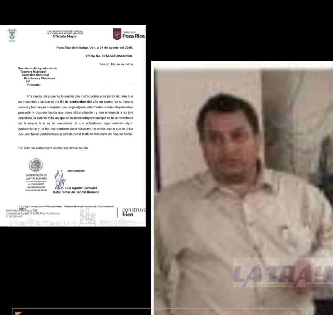 Poza Rica, Ver: Ahora los patos, le tiran a las escopetas, El subdirector de capital humano, Luis Aguilar González, mejor conocido como “El mil Amores”, anda muy alzado desde que le entregaron su nombramiento, pues además de andar acosando a cuánta trabajadora se le pone enfrente, según afirman los mismos trabajadores, ahora giró una orden de presentación inmediata para todos los empleados de confianza del Ayuntamiento, esto pesé a qué Poza Rica continua en semáforo rojo de contagios.