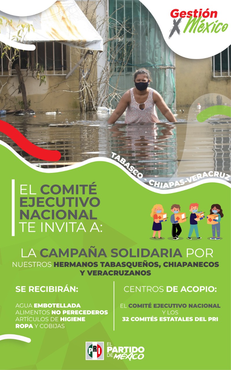 El Presidente del Comité Ejecutivo Nacional (CEN) del Partido Revolucionario Institucional (PRI), Alejandro Moreno, llamó a todas las fuerzas políticas, sociedad civil organizada y población en general a unir esfuerzos para ayudar a los hermanos del sur y sureste mexicano, que han sufrido graves pérdidas ante las lluvias, los desbordes de las presas y ríos. Por ello, la sede nacional de este instituto político y las de sus Comités Estatales abren sus puertas como centros de acopio para ayudar a la ciudadanía.