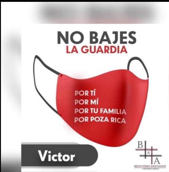 «Hacemos un llamado entre la población de Poza Rica y la región a que no bajemos la Guardia ante esta pandemia que ha causado muchas muertes en nuestra ciudad y a nivel mundial, siendo de relevancia que mediante mi Facebook personal elaboro unos sencillos, pero significativos cubrebocas personalizados, con la leyenda de: -NO BAJES LA GUARDIA, POR TI, POR MI, POR TU FAMILIA, POR POZA RICA, POR TODOS-«, añadió el representante de Corporativo Benavides & Asociados.