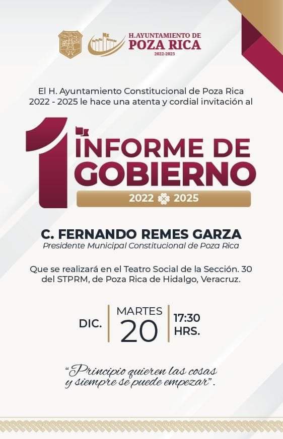 De cuerdo con el alcalde, Fernando Remes Garza, estará llevando a cabo su informe de actividades el próximo 20 de diciembre, en punto de las 17 horas en el teatro de la sección 30, por lo que ya se está trabajando en este para poder presentar a la ciudadanía el trabajo que se ha venido realizando a lo largo de su primer año de Gobierno.