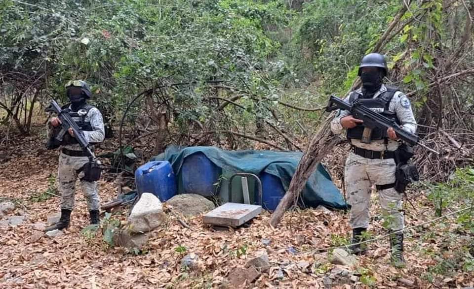 La Guardia Nacional informó la localización de un presunto laboratorio de drogas sintéticas en una zona montañosa de Durango, donde había precursores químicos.