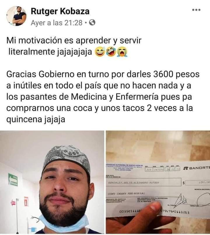 “Mi motivación es aprender y servir, literalmente. Gracias gobierno en turno (Morena) por darles 3,600 pesos a inútiles en todo el país que no hacen nada y a los pasantes de medicina y enfermería pues pa’ comprarnos una coca y unos tacos 2 veces a la quincena”, escribió el joven acompañado de fotos de su cheque.