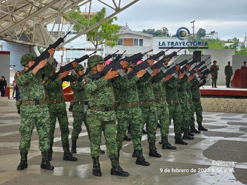 Autoridades del distrito V, Guardia Nacional y Militares de Poza Rica se dan cita en el domo de la plaza cívica.