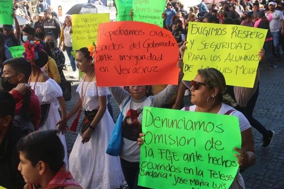 Xalapa, Ver: Padres de familia y estudiantes de la Telesecundaria José María Luis Mora de esta capital marcharon por las calles del centro de la ciudad en protesta por la ola de violencia y hostigamientos que ha sufrido la comunidad escolar.