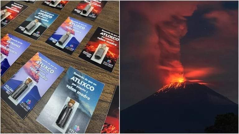 Ante el peligro derivado de la actividad volcánica del Popocatépetl, ciudadanos de Atlixco, Puebla, encontraron en las malas noticias una oportunidad de negocio. “Recuerdo de las entrañas del volcán Popocatépetl” y “Recuerdo de que en Atlixco por poco valen madr*”, son dos curiosos souvenirs que se venden por la módica cantidad de 20 pesos mexicanos.